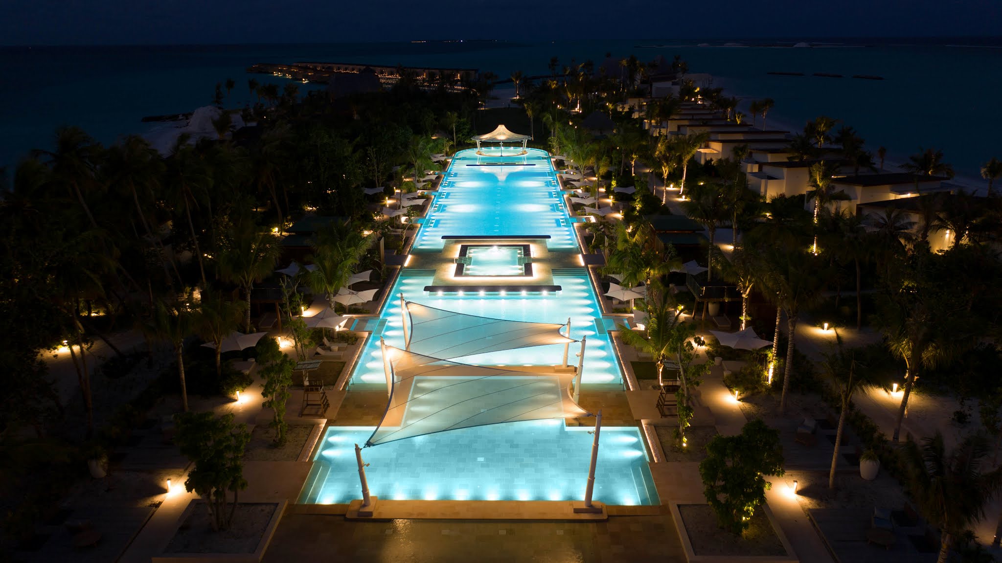 The property touts themselves as a five star luxurious property, with an impressive line-up of gourmet dinning options, Beachfront viewing spa and the "2nd Largest pool in Maldives" is there for all guests to enjoy with sunbeds, cabanas and bars surrounding them.